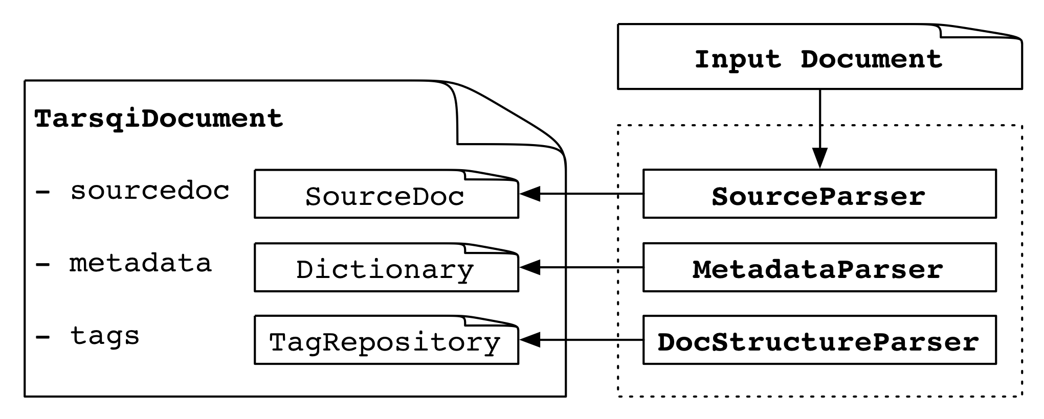 SourceParser. When the source parser applies, the main variables on the TarsqiDocument (source, metadata, options and tags) are not filled in yet. As the first part of step 1, the TarsqiDocument is processed by one of the subclasses of docmodel.source_parser.SourceParser. These classes parse the input file using parse_file(filename) and build the embedded SourceDoc instance in the source variable.