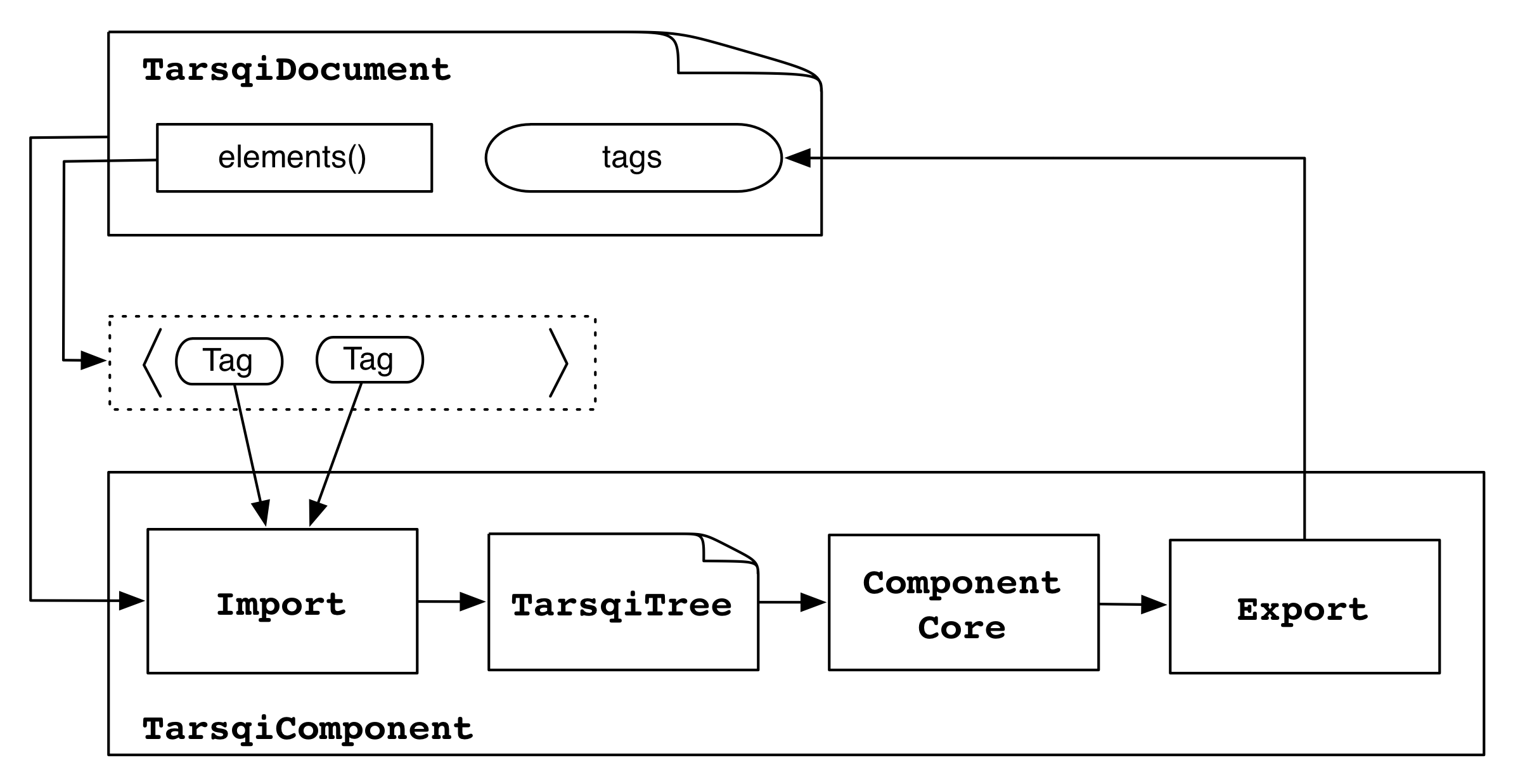 Components import the TarsqiDocument and for each Tag create a TarsqiTree using the TarsqiDocument's data. They then use this sequence of trees one by one as input to processing and export the resulting tags back into the TagRepository. The next component in the pipeline will start afresh with a new set of TarsqiTrees which will be created from the updated TarsqiDocument.